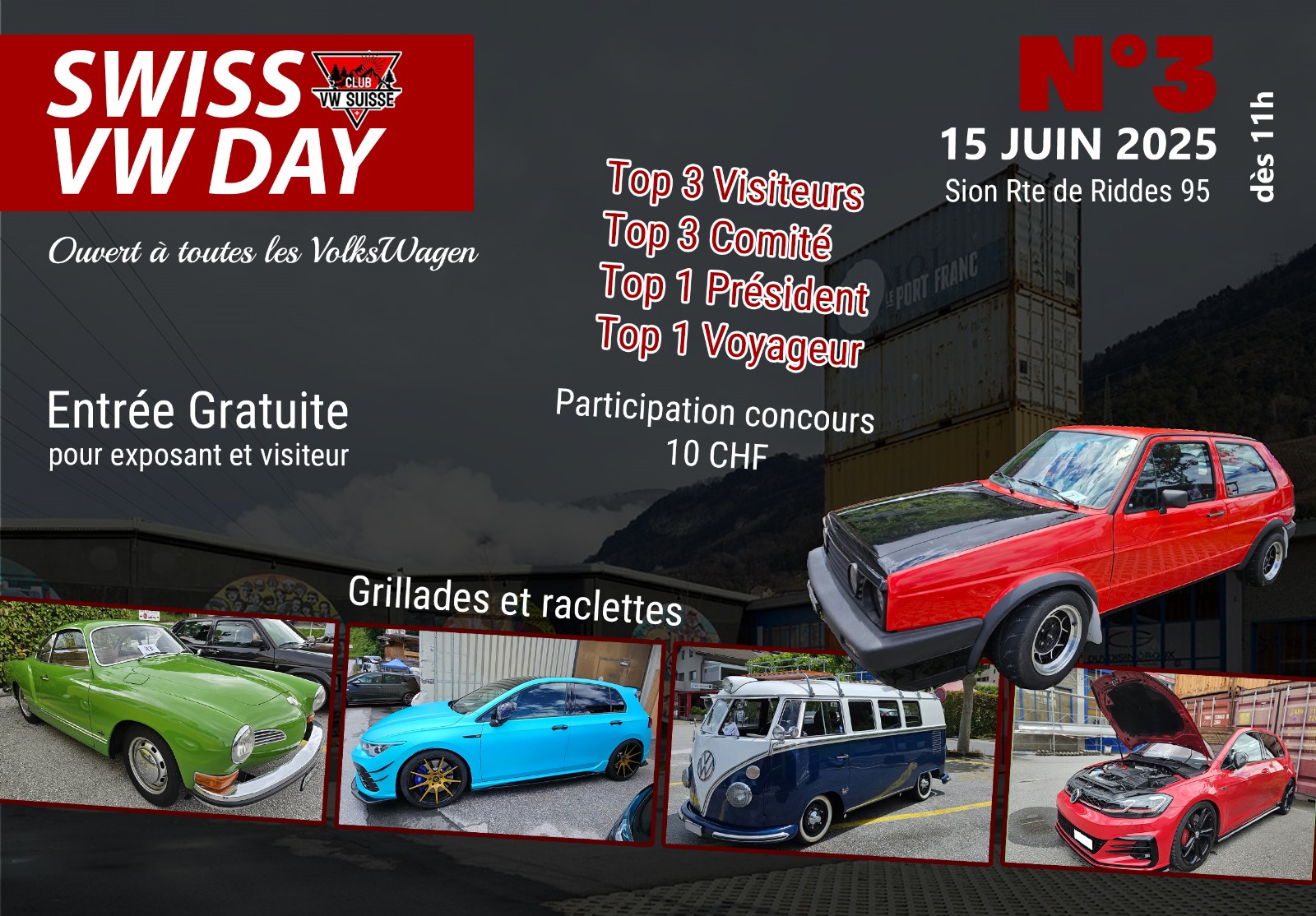 SWISS VW DAY N°3 par PiiWii_Master_26 | Oct 3, 2024 Les Inscriptions ont fermées SWISS VW DAY N°3 par Club Vw Suisse 286 286 people viewed this event. Date et heure 15-06-2025 @ 11:00 à 15-06-2025 @ 19:00 Lieu Rte de Riddes 95, 1950 Sion Partager avec des amis Facebook Twitter Linkedin Xing Pinterest
